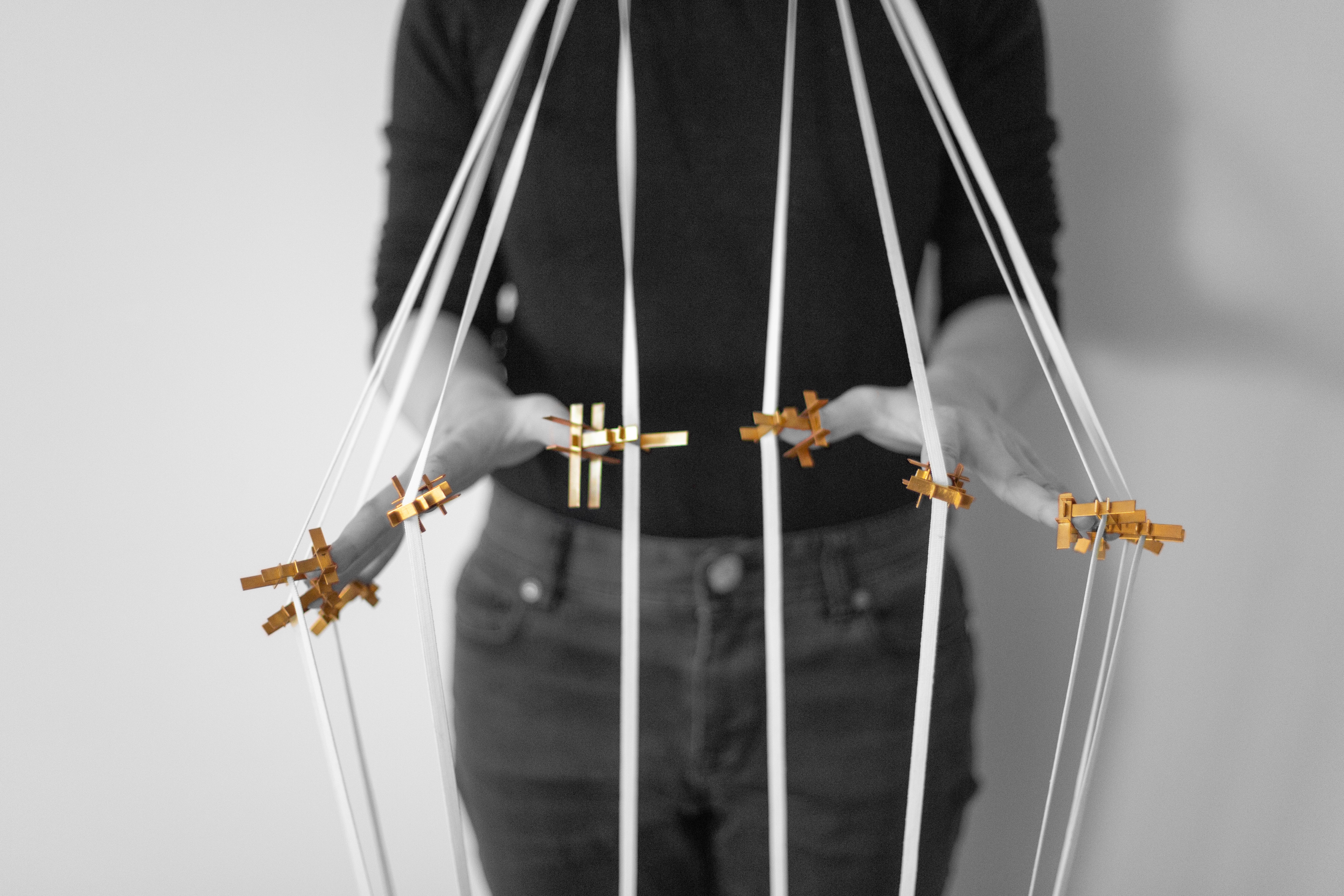 The movements are revealed by the glow-light of threads in the darkness, where the body can be seen as absence.